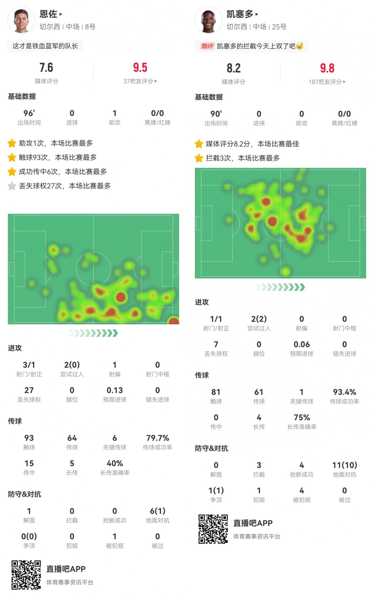 本场比赛恩佐与凯塞多的发挥可圈可点。“尝试助攻王”恩佐总算“捡”到一个助攻,库库雷利亚的制胜球便是由恩佐传导。凯塞多则继续自己的战神级发挥,本场比赛贡献12次对抗11次成功,还有3拦截4抢断0被过的铁闸表现。切尔西的双腰进可攻退可守,正是蓝军本赛季战绩不错的原因之一。