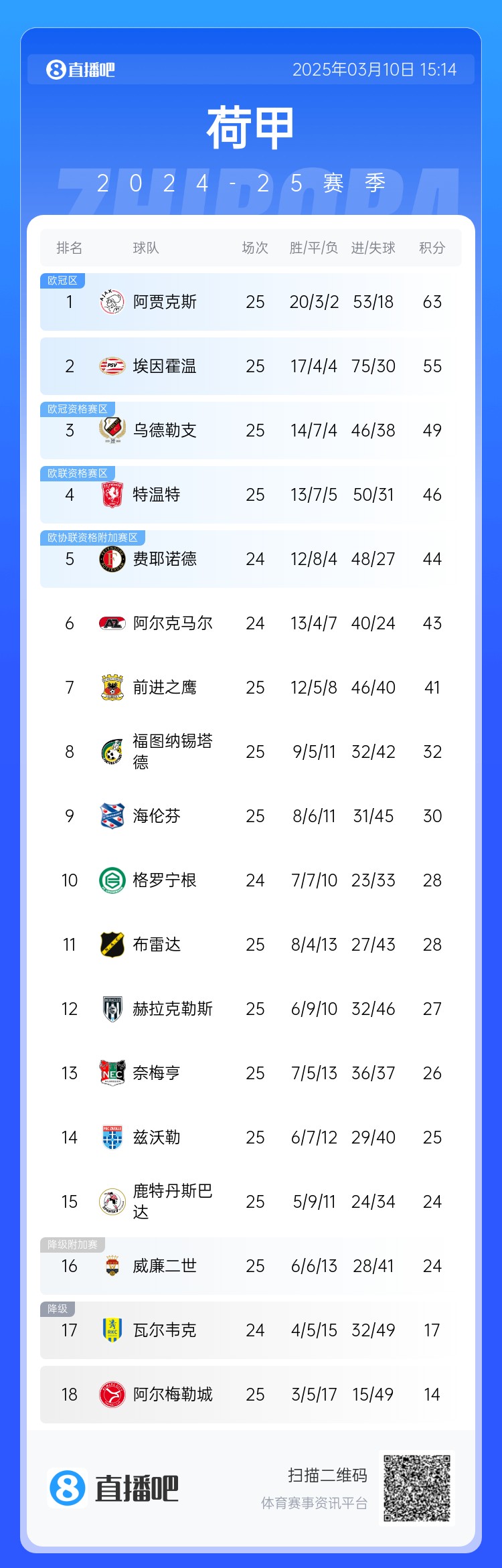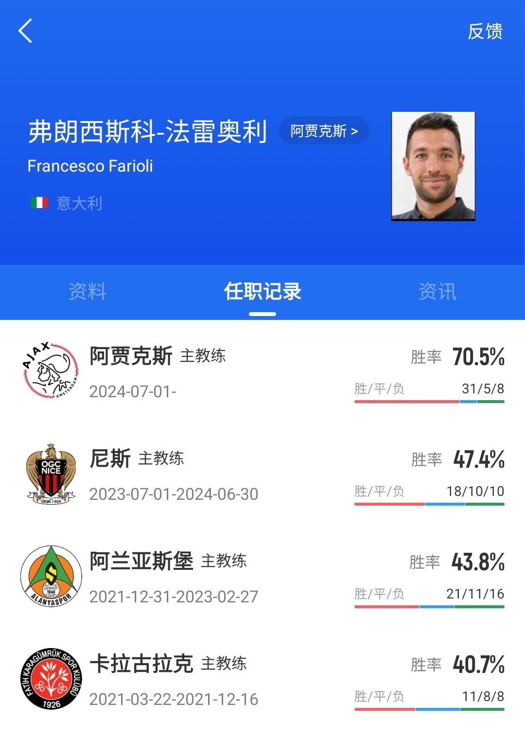 本赛季在35岁的意大利少帅法雷奥利的带领下,阿贾克斯还剩9轮8分领跑荷甲积分榜,有望时隔2个赛季重夺荷甲冠军。