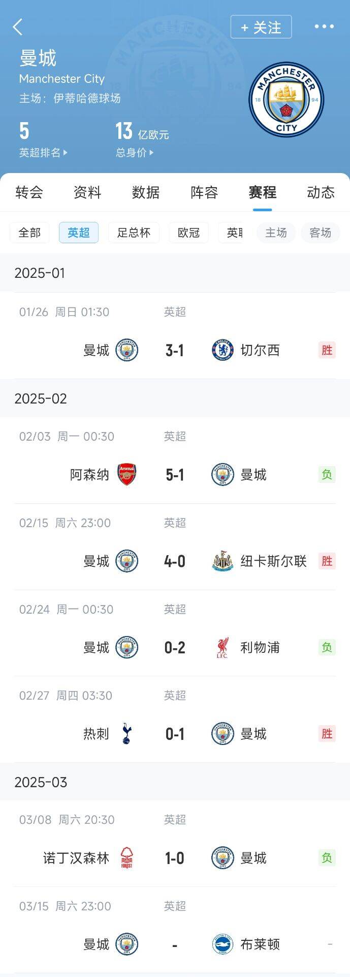 曼城近6轮打完英超第1/2/3/4/6收获2胜3负,魔鬼赛程终点站打第7