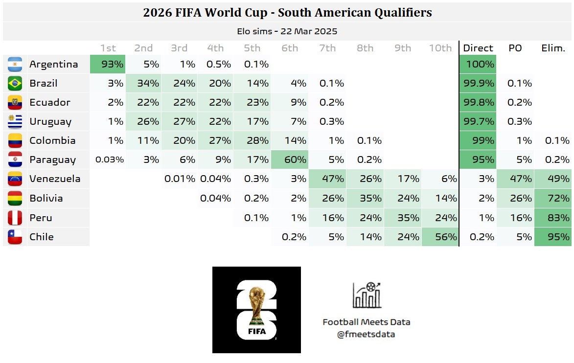 03月22日讯 2026世界杯预选赛南美区已进行到第13轮,数据机构Football Meets Data给出了各队最新的晋级概率。