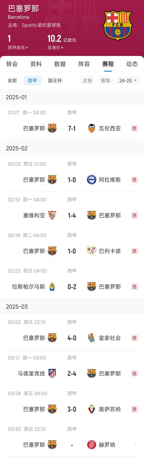 巴萨:8连胜(本轮未赛)
