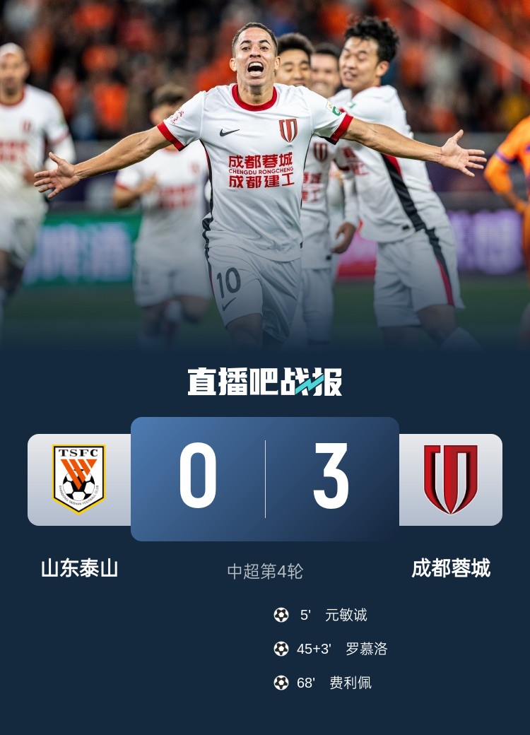 中超第4轮,成都蓉城客场3-0完胜山东泰山,终结了对对手的三连败。