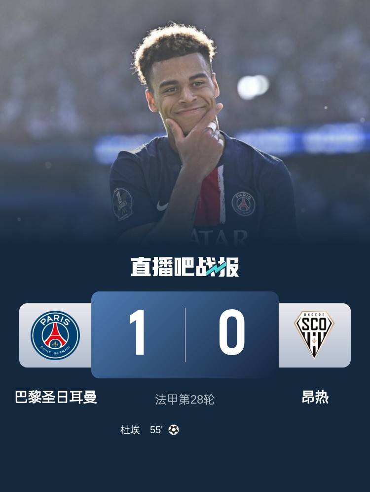 法甲第28轮,巴黎圣日耳曼主场1-0击败昂热,提前6轮锁定冠军。上半场,帕乔破坏单刀,维蒂尼亚远射造险;下半场,克瓦拉茨赫利亚助攻杜埃抢点破门。
