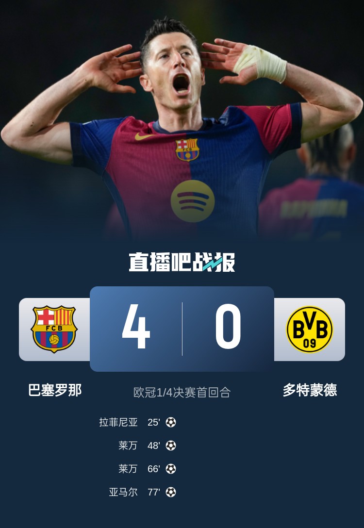 04月10日讯 欧冠1/4决赛首回合,巴塞罗那坐镇主场4-0大胜多特蒙德。