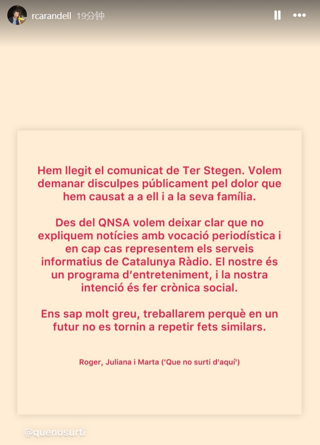从节目《Que no surti d’aquí》的角度,我们想明确表示,我们并非以新闻视角报道事件,也不代表加泰罗尼亚广播电台的新闻服务。我们的节目是娱乐性质的,我们的目的是进行社会纪实。